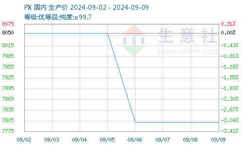 9月9日中石化销售公司对二甲苯价格执行7800元/吨,较9月2日价格下滑250元/吨。周期内外盘PX价格持续下行,截止9月6日CFR中国收盘价格865-867美元/吨,较8月30日927-929美元/吨,累计下调62美元/吨。