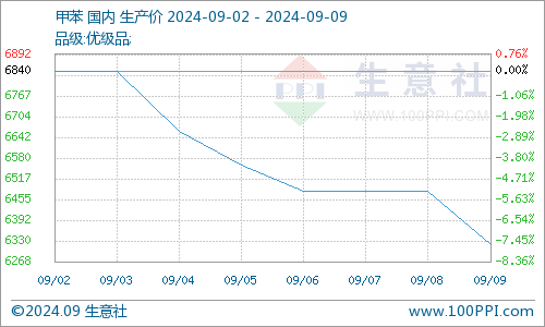 据生意社商品行情分析系统显示,近日(9.2-9.9)甲苯市场整体下行。9月2日甲苯基准价在6840元/吨,9月9日甲苯基准价在6320元/吨,周期内下跌7.6%。本周期甲苯市场接续保持偏弱运行,市场价格震荡下行。周内原油市场下行,拖累甲苯市场心态偏弱,供应方面本周华东、华南地区甲苯库存整体偏低,但下游观望心态下,市场交投明显偏冷清。主营炼厂多次下调出厂价,地炼企业报价连续下调,下游观望,采购积极性普遍偏弱。截止9月9日华东地区主流报价区间在6200-6250元/吨,较上周同期价格下调600-650元/吨。