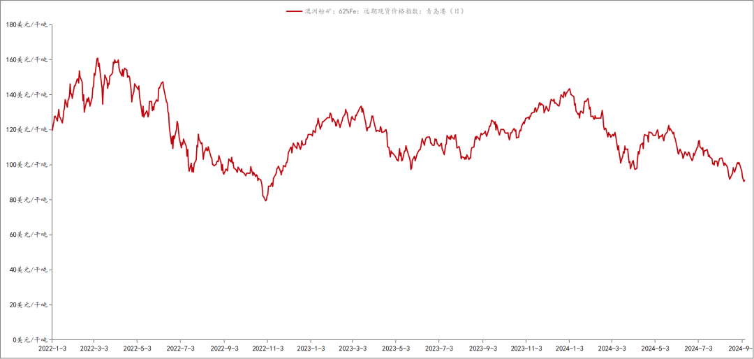 上海钢联数据显示,9月6日青岛港澳洲粉矿(62%)的远期价格指数为90.45美元/干吨,为自2022年11月以来的最低价格水平。