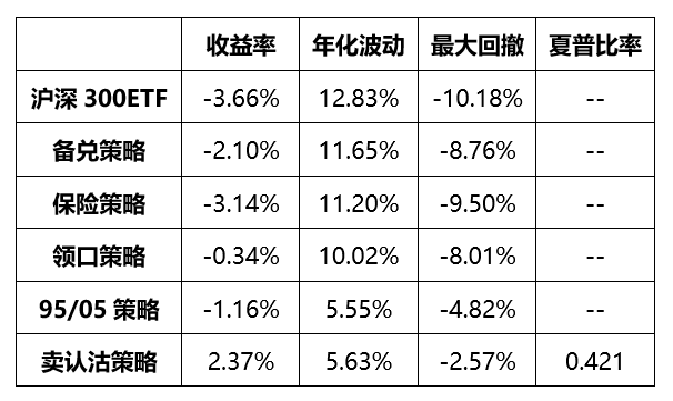 年初至今,现货逐步企稳,卖认沽策略表现较好。五个策略的具体表现如下: