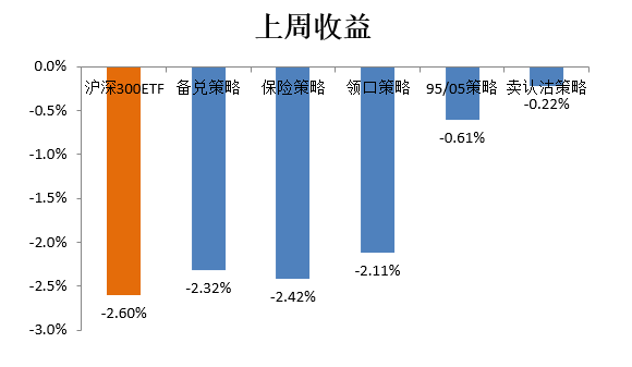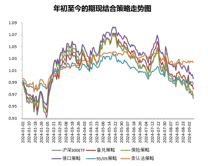 我们对期现结合的五个策略(备兑、保险、领口、95/05配置、卖认沽)及沪深300ETF现货,在上周(2024.9.2-2024.9.6)的表现进行了回测。上周沪深300ETF下跌,各期现结合策略表现均优于现货。具体结果如下:
