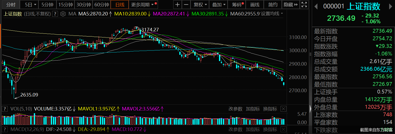 交易行情显示,A股三大股指集体低开,开盘后保持震荡态势,截至收盘,上证综指收跌1.06%,报2736.49点,再创今年2月6日以来新低。据了解,上证综指年内曾于2月5日盘中触及2635.09点的低点,随后迎来一波反弹,在2月6日—23日实现八连阳。