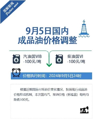 上证报中国证券网讯 据国家发展改革委9月5日消息,9月5日国内成品油价格按机制调整:根据近期国际市场油价变化情况,按照现行成品油价格形成机制,本次国内汽、柴油价格(标准品)每吨均降低100元。