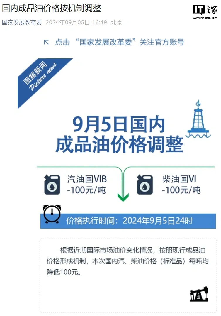 IT之家 9 月 5 日消息,国家发展改革委今日发布公告,根据近期国际市场油价变化情况,按照现行成品油价格形成机制,本次国内汽、柴油价格(标准品)每吨均降低 100 元。