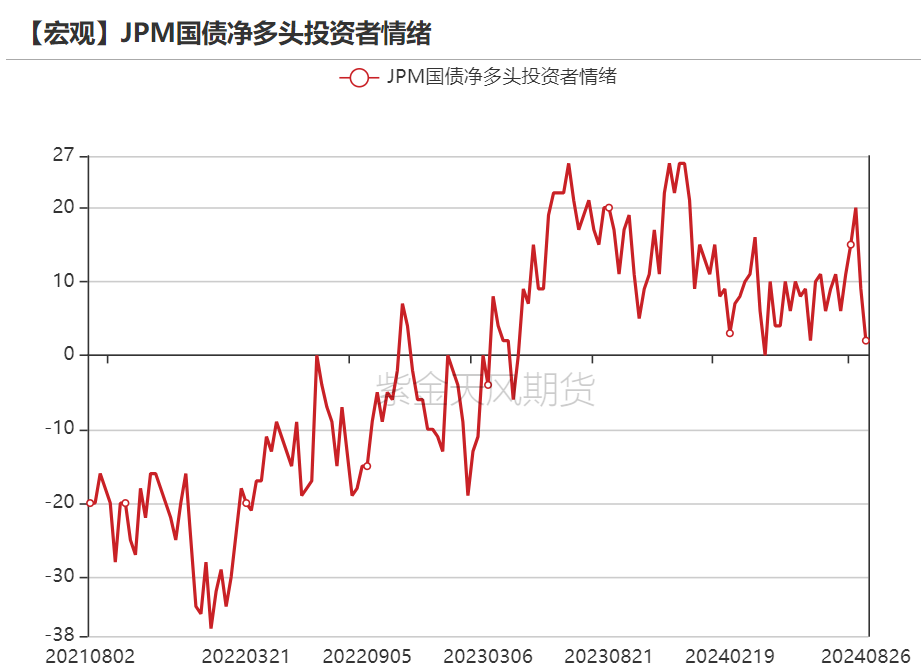 截至8.26当周,JPM国债净多头投资者情绪回落至2024年6月以来最低水平。