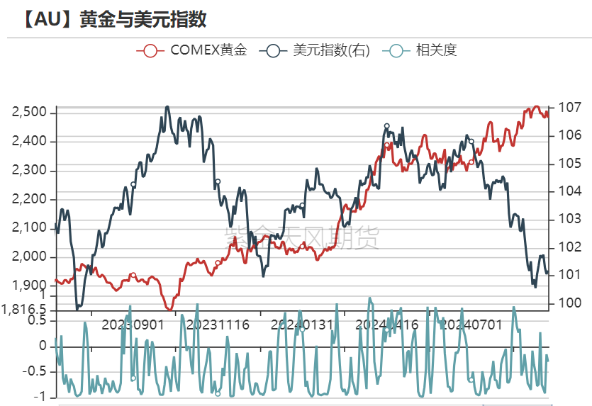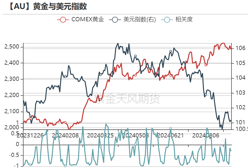 上周美元指数与黄金价格同向变动,黄金下跌0.24%,美元指数下跌0.5%至101.2,两者滚动相关性走低。