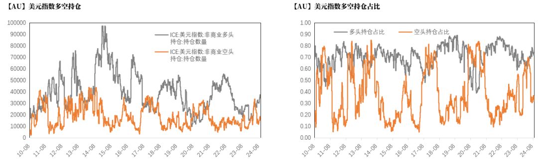 截止9.3,美元指数总持仓减少,非商业多头持仓环比减少2652张至3.47万张,非商业空头持仓环比减少3168张至1.53万张,多头力量主导;从持仓占比来看,非商业多头持仓占比为72%,较上周减少,空头持仓占比为31%,较上周减少。