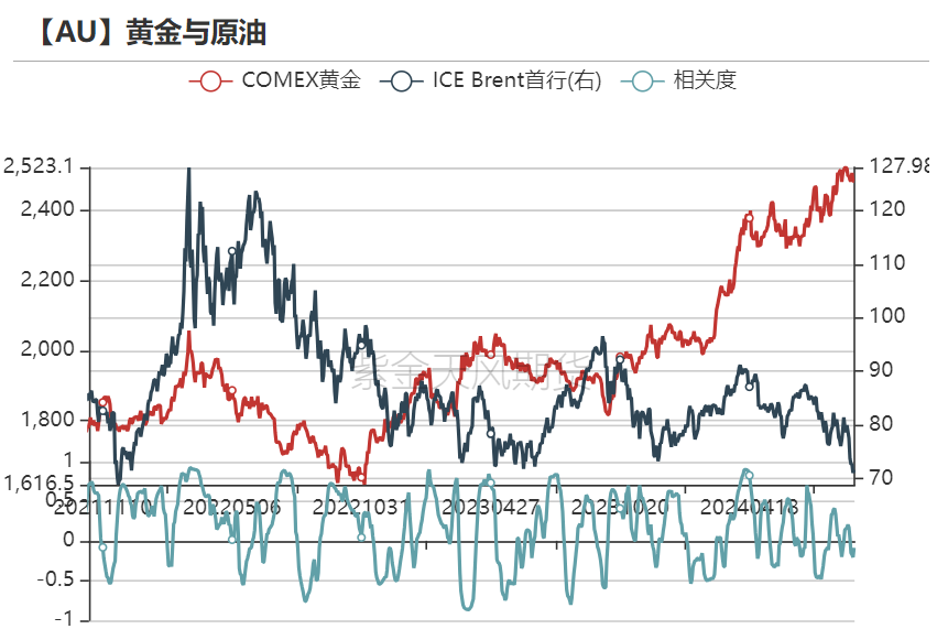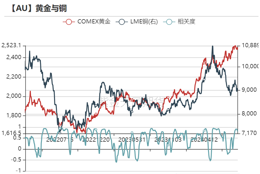 从滚动相关性的角度来看,黄金与美元指数的相关性走低、与原油、铜相关性走高。