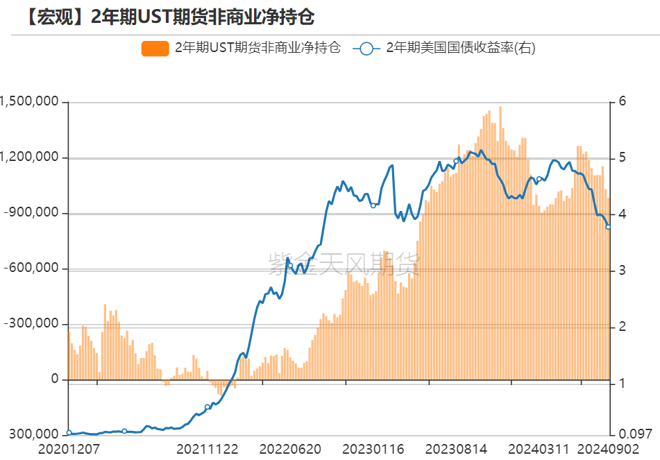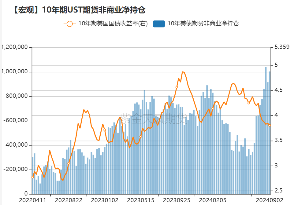 截止9.3的数据,美债利率持仓分化,2年期UST期货非商业净持仓空头减少46648手至982462手;10年期UST期货非商业净持仓空头增加88390手至1002827手。