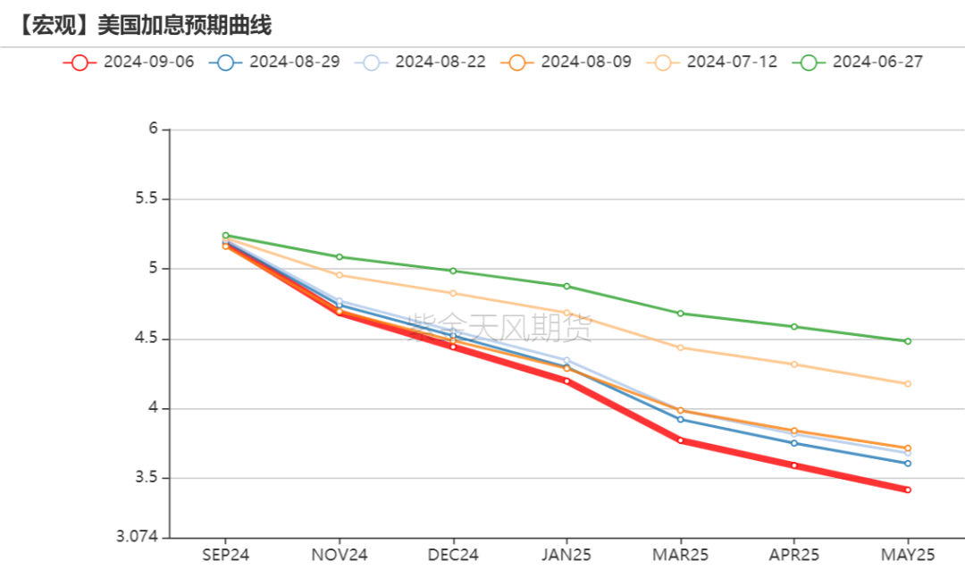 上周受劳动力市场一系列数据减速的影响,美国加息预期曲线下移,利率期货计入到2024年底115bps的降息预期,9月、11月和12月的会议降息的幅度分别为25bps、50bps和50bps。