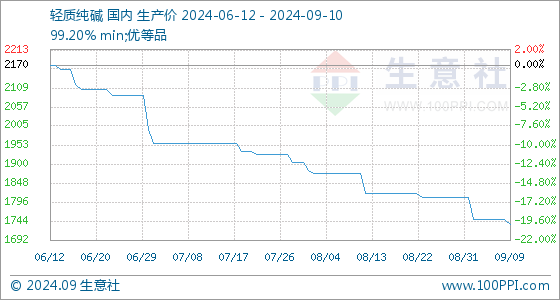 9月10日,生意社轻质纯碱基准价为1736.00元/吨,与本月初(1810.00元/吨)相比,下降了-4.09%。