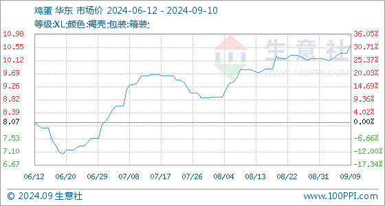 9月10日,生意社鸡蛋基准价为10.62元/公斤,与本月初(10.18元/公斤)相比,上涨了4.32%。