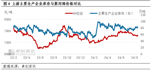 如上图可见,7-8月上游主要生产企业库存震荡上涨,7月库存高点在中旬的80万吨,8月高点在中旬的83.5万吨。库存持续累积且高于去年同期,一方面反馈下游需求疲软令货源向下传导阻力较大,另一方面供应压力增加无疑对PP价格及市场信心形成冲击。