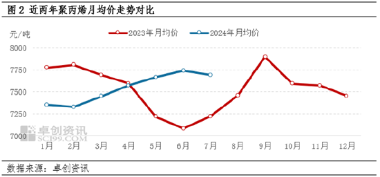如上图可见,二季度聚丙烯华东拉丝月均价环比涨幅在1.60%、1.26%、0.96%,涨幅逐月收窄。主要受宏观政策集中释放及成本支撑偏强,PP市场心态受到提振而价格连续上调,但实际需求放量不足令价格上行承压,涨势放缓。随后进入传统淡季,下游需求进一步转弱对行情的压制上升至主导低位,7月份聚丙烯华东拉丝月度均价跌至7691.96元/吨,环比上月跌0.60%。截至8月16日,8月聚丙烯月均价在7447.08元/吨,环比7月均价跌3.18%。
