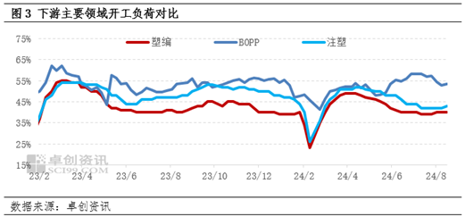 随着淡季需求持续疲软,市场操作信心也受到严重影响。下游订单量有限,制品库存累积及盈利水平不佳等因素拖累,工厂生产积极性受挫而开工负荷降至低位。据调研,虽下游工厂原料库存处于偏低水平,但订单未改善及信心欠佳,入市依旧坚持择低刚需补货为主,部分中小型企业面对亏损而选择停车。据卓创资讯数据统计,7月至目前下游塑编行业开工负荷维持在4成左右,较去年同期低1-2个百分点;注塑行业开工负荷维持在42%-43%,较去年同期低6-7个百分点;BOPP行业开工负荷从58%降至53%附近,在此期间BOPP行业开工负荷阶段处于高位,主要因为前期停车装置重启及部分新产线进入,并非需求带动。总而言之,下游需求疲态延续对行情的压制最为明显,但供应端对PP价格的影响也发生了一定变化。