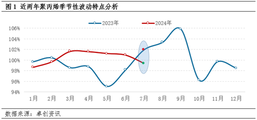 7月份聚丙烯市场呈现跌势,波动趋势与去年同期涨势相背离。上图以华东拉丝为例,二季度聚丙烯价格逐月上涨,但涨势逐月放缓;自此可见当时市场上行压力已逐渐显现,淡季7月随即进入下滑通道,而就目前供需形势来看,8月份延续同期背离趋势的可能依然存在。