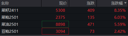 金融界9月3日消息,菜粕主力合约触及涨停,涨幅6.03%,报2375元/吨,菜油一度涨超6%,报8933元/吨。消息面上,商务部将依法对自加拿大进口油菜籽及相关化工产品发起反倾销调查。