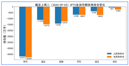 据美国商品期货委员会公布的2024-09-03期货市场头寸持仓报告显示,上周各货币的报告总持仓情况如下:欧元净空头变化751手,澳元净空头变化3702手,英镑净多头变化1866手,日元净空头变化186手,加元净空头变化3182手,纽元净空头变化1737手,上周没有总持仓多空转换的货币。除此之外,单向总持仓变动超过20%的货币有:澳元,加元,纽元。