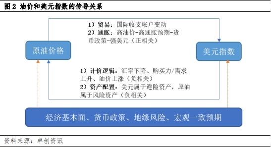 美元影响油价大致有计价逻辑和资产配置两条路径,并且都是负相关传导。计价逻辑下,美元贬值会使得购买力/名义需求增加,从而带动油价上涨。资产配置的框架下,美元具有避险属性,而原油作为大宗商品属于风险资产,当市场风险偏好下降时,资金从商品市场撤离而进入美元,也会出现美元涨原油落的结果。