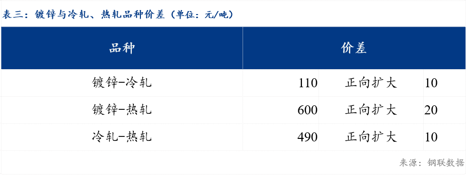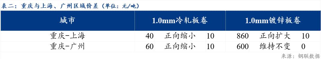 重庆、上海地区冷轧板卷区域价差缩小10元/吨;重庆、广州冷轧板卷区域价差缩小10元/吨。重庆、上海镀锌板卷区域价差扩大10元/吨;重庆、广州镀锌板卷区域价差维持不变 。镀锌、冷轧品种价差扩大10元/吨 ;镀锌、热轧品种价差扩大20元/吨 ;冷轧、热轧品种价差扩大10元/吨。