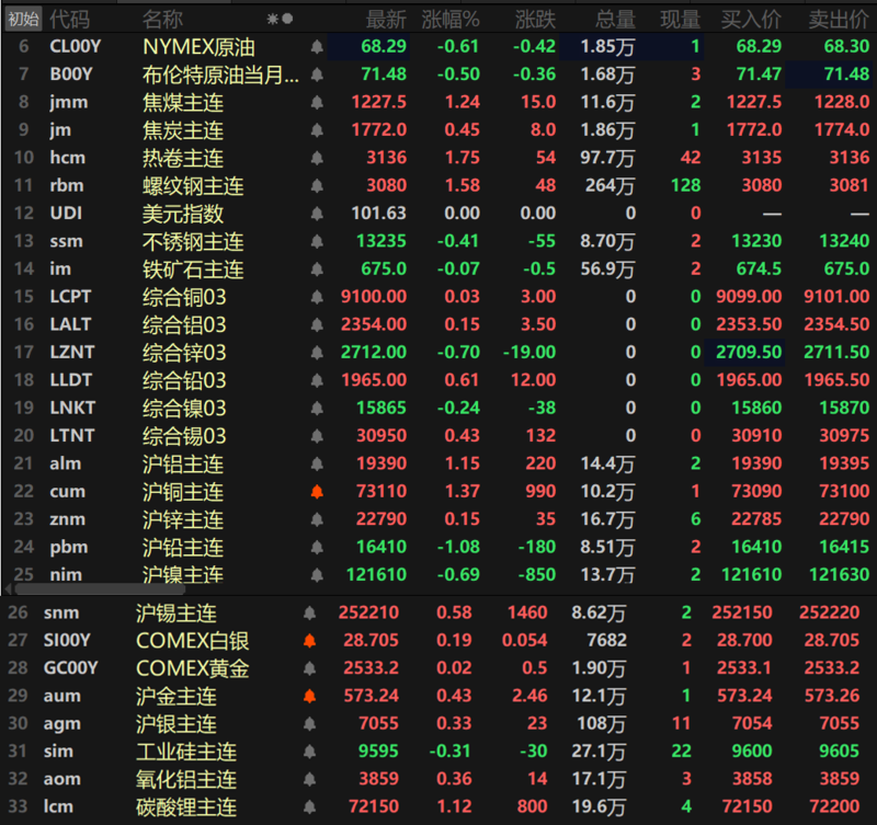 黑色系方面除了不锈钢、铁矿外均录得不同程度的上涨,不锈钢跌0.41%,铁矿跌0.07%。螺纹、热卷齐齐涨逾1%。热卷涨1.75%,螺纹涨1.58%。双焦方面,焦煤涨1.24%,焦炭涨0.45%。