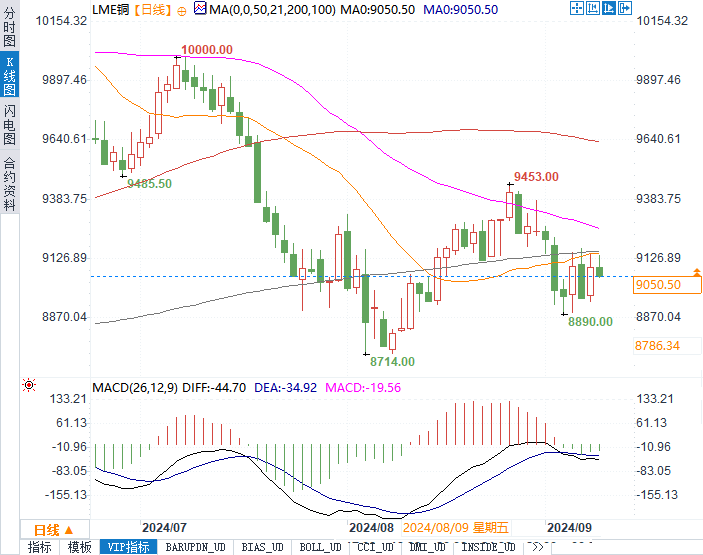 汇通财经APP讯——周二(9月10日),全球铜市场走势继续显现出不确定性。伦敦金属交易所(LME)三个月期铜价格在9090.50美元/吨附近震荡下滑,早盘一度出现0.5%的反弹,但随后下跌0.1%。与此同时,上海期货交易所的主力10月期铜合约上涨1.4%,至每吨73110元人民币(约10268.40美元),呈现出追随隔夜伦敦期铜涨势的行情。