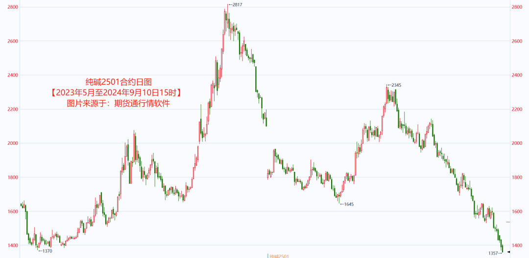 由于基本面的弱势格局,玻璃和纯碱这两个期货品种,分别从2024年5月底至今,已持续了约4个月左右的下跌行情,目前来看,无论从基本面情况,还是盘面走势结构来看,这两个期货品种仍处于弱势寻底阶段,暂无止跌企稳筑底迹象。