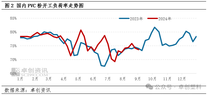 9月第一周,因部分8月份检修延续至9月,叠加新增2家检修企业,导致周度开工负荷率下降。据统计,截至本周四(9月5日),本周PVC粉整体开工负荷率为73.57%,环比下降0.61个百分点,较去年同期下降0.45个百分点,从图2可以看出,2024年1-8月份PVC 粉平均开工负荷率高于去年同期,高开工叠加新增产能释放,供应端压力增加;需求端,在房地产下行周期下,需求占比较中高的管材订单较差,软制品订单整体表现略好,但因在下游需求中占比较少,对实际需求带动不足。