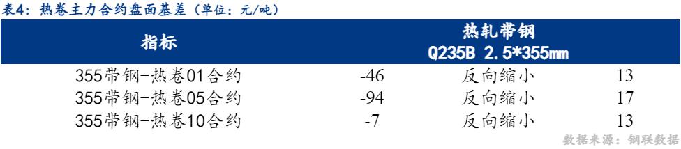 10日市场热卷01合约与355带钢价差反向缩小13元/吨,热卷05合约与355带钢价差反向缩小17元/吨。