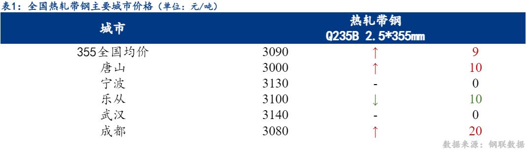 10日热轧带钢全国主要城市价格涨跌互现,截至发稿时2.5*355mm热轧带钢均价3090元/吨,较昨上涨9元/吨,其中2.5*355mm主要城市报价为唐山3000元/吨,宁波3130元/吨,乐从3100元/吨。