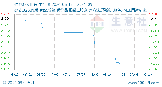 9月11日,生意社棉纱32S基准价为23500.00元/吨,与本月初持平。