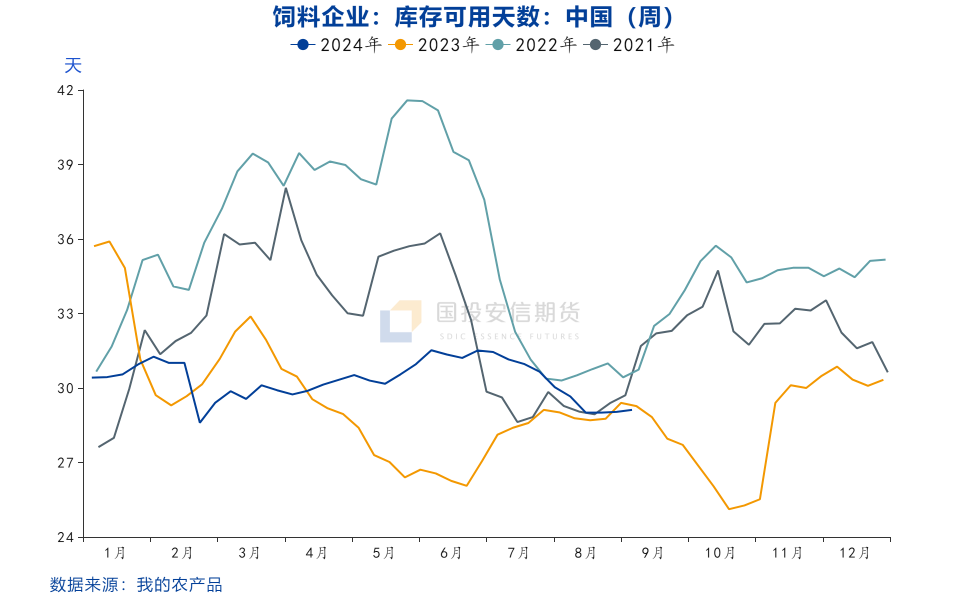 现货方面,局部新季玉米少量上市,据悉辽宁黑山水泡玉米价格较低,二等30水潮粮开秤价格在1700元/吨左右(去年同期在2140元/吨上下),一等新粮少,质量下降。政策粮及进口玉米持续拍卖放出,加上部分陈粮急售,目前供给充足。临近新作上市,下游各方均处在季节性降库阶段,对玉米收购较为谨慎,持续等待中。深加工企业按需谨慎采买,按到车量灵活调整采买价格,截至9月6日,主要深加工企业玉米库存为279.4万吨,连续5个月下降。饲料企业补库同样进展缓慢,饲料企业库存可用天数近一个月保持在29天左右,库存较低。各方均在等待新粮上市后再建立库存。