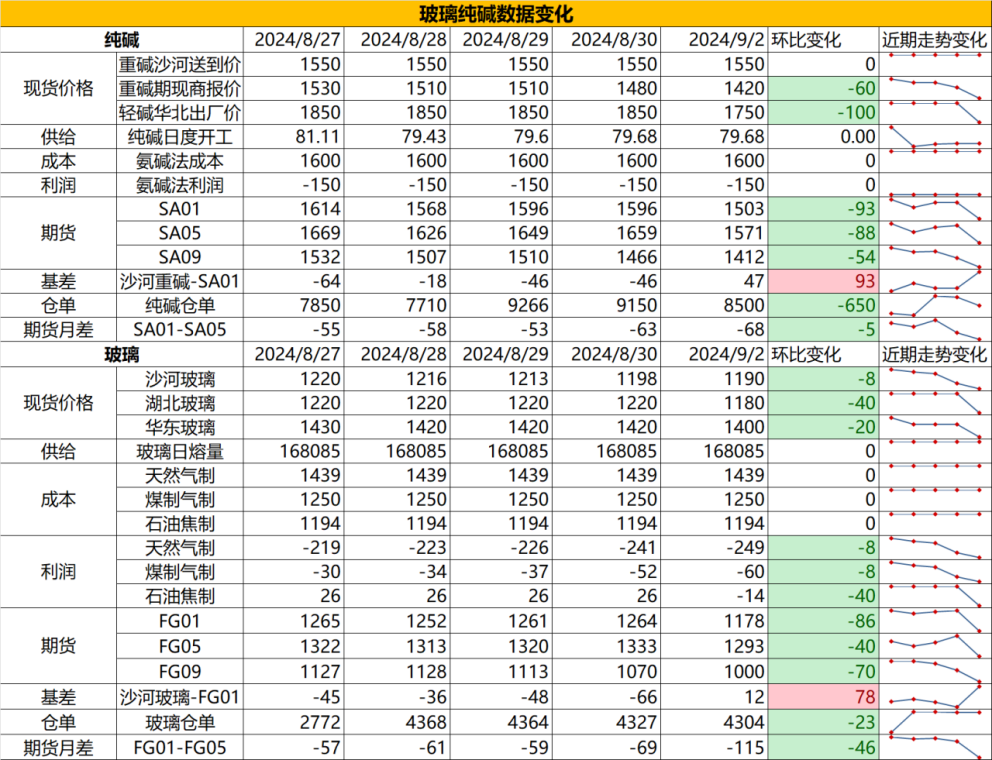当前碱厂送到价格在1550元/吨左右,期现价格在1420元/吨,本周由于部分企业检修推迟,开工仍会维持75-80%的低位,短期纯碱仍处于相对平衡状态,但下游前期已完成小幅补库,9月中旬后产量回升预期强,后续大概率累库压力会持续加大。