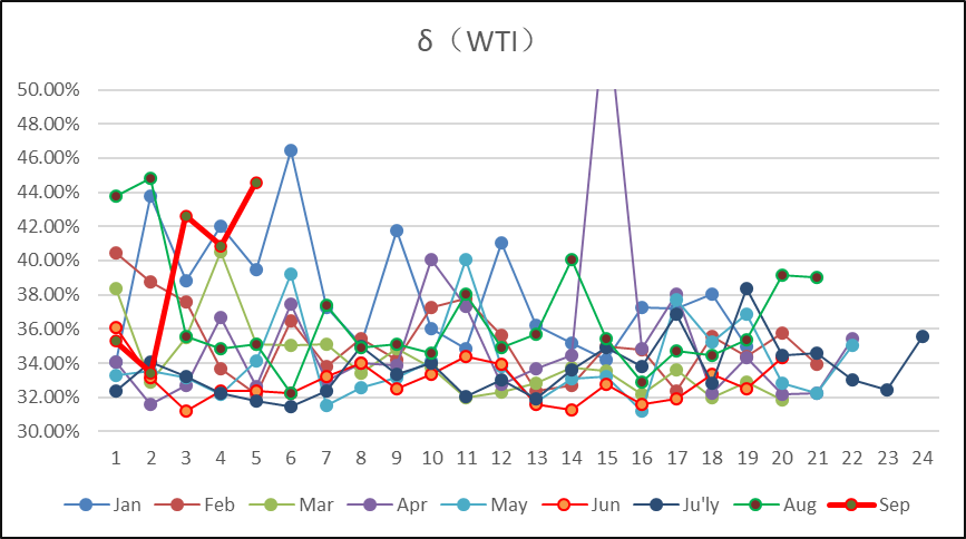 美原油价格连续9周下降,从历史波动率观察,RS模型下,9月初波动率35.29%,随着价格下跌,波动率上升到季节性高位44.57%,根据波动率回归特性,波动率近期可能存在回落风险,如下图所示: