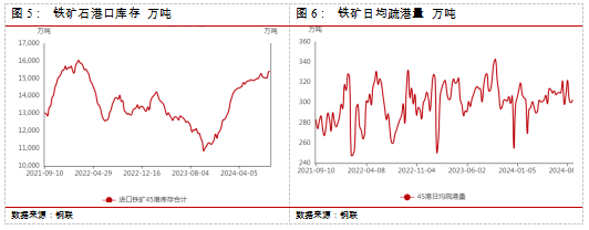 Mysteel数据,上周,全国45港进口铁矿石库存总量15408.95万吨,环比增36.57万吨;45港日均疏港量302.7万吨,环比增2.7万吨。全国钢厂进口铁矿石库存总量为8858.27万吨,环比减少138.2万吨;当前样本钢厂的进口矿日耗为274.03万吨,环比增加1.85万吨,库存消费比32.33,环比减少0.72天。