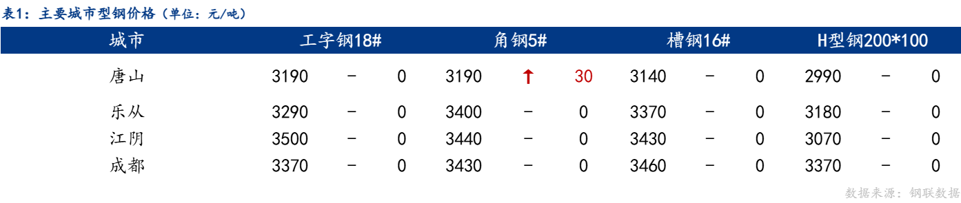 今日型钢价格稳中趋强运行,唐山工字钢、槽钢、H型钢价格较上一交易日持稳,角钢价格较上一交易日上涨30元/吨;乐从工字钢、角钢、槽钢、H型钢价格较上一交易日持稳;江阴工字钢、角钢、槽钢、H型钢价格较上一交易日持稳;成都工字钢、角钢、槽钢、H型钢价格较上一交易日持稳。