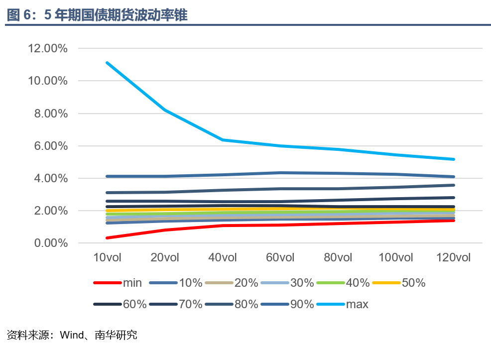 五年期国债期货20日历史波动率是2.01%,位于历史40%——50%分位值之间,处于历史合理水平。