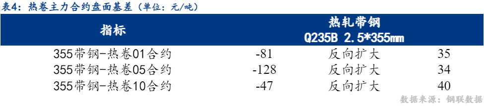 11日市场热卷01合约与355带钢价差反向扩大35元/吨,热卷05合约与355带钢价差反向扩大34元/吨。