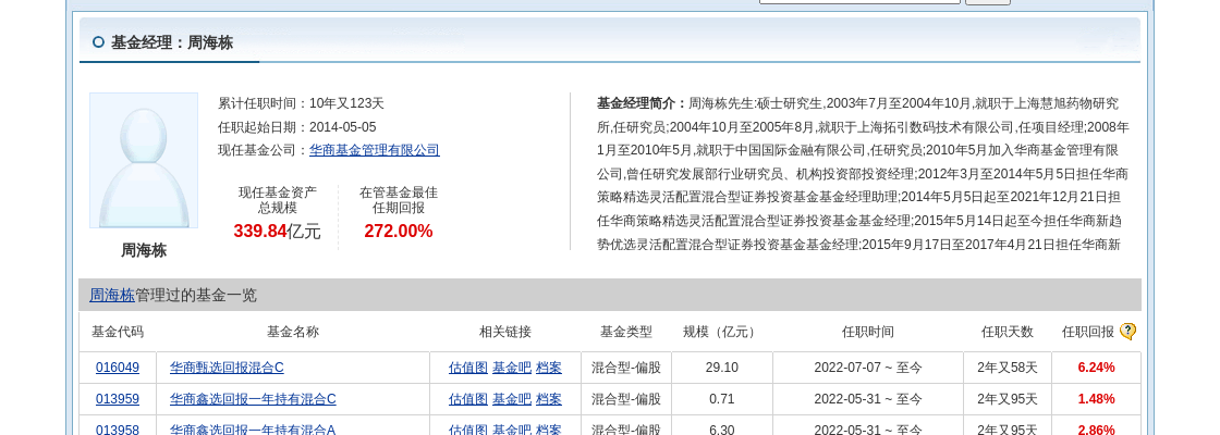 简历显示,周海栋先生:硕士研究生,2003年7月至2004年10月,就职于上海慧旭药物研究所,任研究员;2004年10月至2005年8月,就职于上海拓引数码技术有限公司,任项目经理;2008年1月至2010年5月,就职于中国国际金融有限公司,任研究员;2010年5月加入华商基金管理有限公司,曾任研究发展部行业研究员、机构投资部投资经理;2012年3月至2014年5月5日担任华商策略精选灵活配置混合型证券投资基金基金经理助理;2014年5月5日起至2021年12月21日担任华商策略精选灵活配置混合型证券投资基金基金经理;2015年5月14日起至今担任华商新趋势优选灵活配置混合型证券投资基金基金经理;2015年9月17日至2017年4月21日担任华商新动力灵活配置混合型证券投资基金基金经理;2016年8月5日起至今担任华商优势行业灵活配置混合型证券投资基金的基金经理;2017年12月21日起至今担任华商盛世成长混合型证券投资基金的基金经理;2018年4月11日起至今担任华商主题精选混合型证券投资基金的基金经理;现任投资管理部副总经理、公司投资决策委员会委员、公司公募业务权益投资决策委员会委员。2018年11月26日起至2022年9月21日担任华商乐享互联灵活配置混合型证券投资基金基金经理;2019年3月8日起至2020年4月14日担任华商智能生活灵活配置混合型证券投资基金基金经理。2020年2月20日起至今担任华商恒益稳健混合型证券投资基金基金经理。2021年1月19日起至今担任华商甄选回报混合型证券投资基金的基金经理。