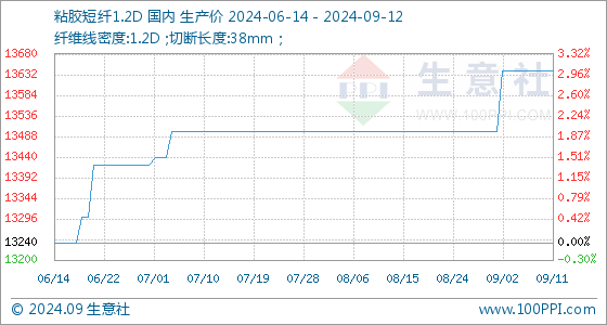 9月12日,生意社粘胶短纤1.2D基准价为13640.00元/吨,与本月初(13500.00元/吨)相比,上涨了1.04%。