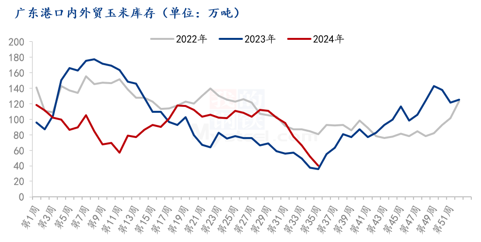 据Mysteel调研显示,截至2024年8月30日,广东港内贸玉米库存共计20.6万吨,外贸库存19.7万吨,内外贸玉米共计40.3万吨,较上月底减少55.2万吨,减少57.80%。与北方港口库存情况类似,南方港口库存整体也是高于去年同期水平,多数时间下游采购并不积极。自7月中旬开始,港口到货量逐渐减少,消化库存为主,港存去库存加速。进入8月份,广东港玉米到货量大幅减少,月内内贸玉米船期出现断档,外贸玉米到船仅7万吨左右,港口贸易商可售现货库存偏紧。消息面传四季度进口替代谷物减少,提振市场心态,饲料企业采购积极性提升,港口走货加快。