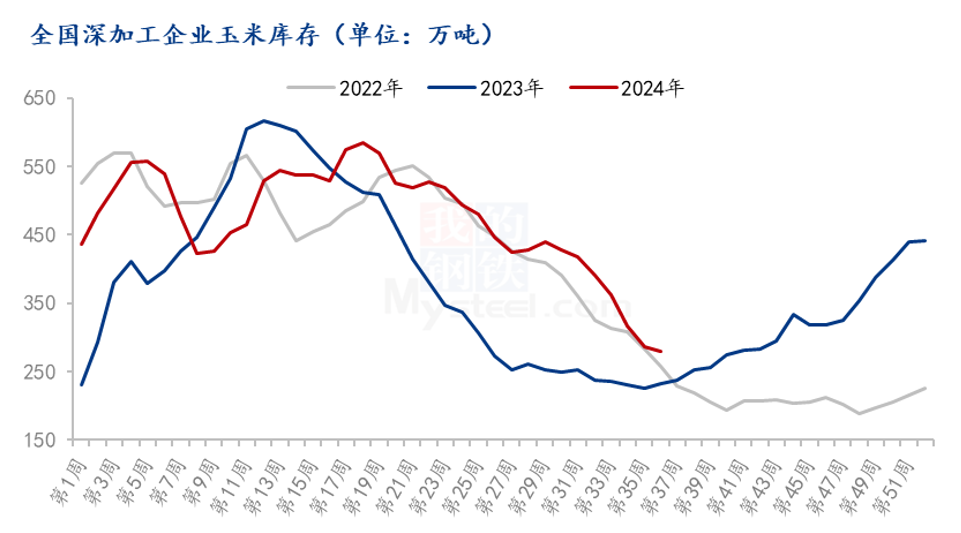 据Mysteel农产品调研显示,截至2024年9月4日,全国12个地区96家主要玉米加工企业玉米库存总量279.4万吨,降幅2.58%。深加工企业建库意愿不强,9月随着新玉米上市临近,企业开始有意识地降库存,从20多天逐渐降至10天左右,库存需求逐步减弱。