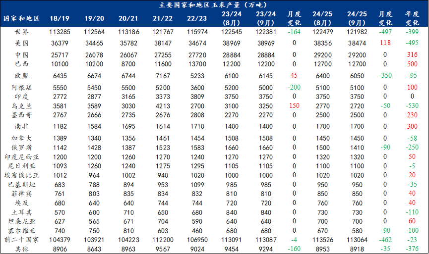 2024/2025年度世界玉米产量较上月预估调减497万吨,至12.22亿吨。其中美国玉米产量较上月预估调增118万吨,欧盟、乌克兰和俄罗斯玉米产量较上月预估有所调减。产量前二十国家和地区总产量较上月预估调减4625万吨,至11.31亿吨。