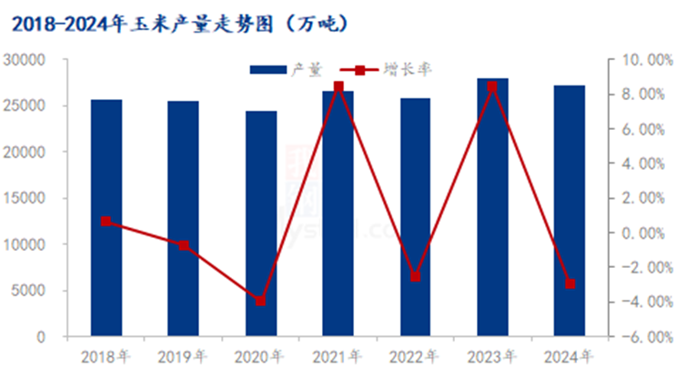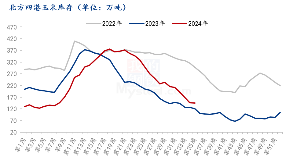 2024年受种植面积减少及天气影响,玉米产量出现下降。据Mysteel农产品玉米团队调研,预计2024年玉米产量27209万吨,较2023年减少823万吨,下降幅度2.94%。虽然2024年新玉米有减产的预期,但在新粮上市季节和市场心态持续偏弱的情况下,减产的利好基本被忽略。