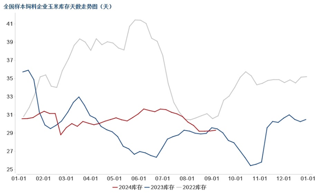 根据Mysteel玉米团队对全国18个省份,47家规模饲料厂的最新调查数据显示,截至9月5日,全国饲料企业平均库存29.12天,较上周增加0.08天,环比上涨0.28%,同比下跌0.51%。从上图可知,本年度饲料企业心态更趋谨慎,基本维持在20-30天左右,滚动补库。上半年我国工业饲料产量小幅下降,终端消费持续不佳,且进口替代谷物供应充足,价格优势较大,饲企采购玉米意愿偏低。整体来看,饲料企业需求较往年偏低,且对新季玉米持悲观预期,需求难有明显提升,仍维持按需采购,控制库存。