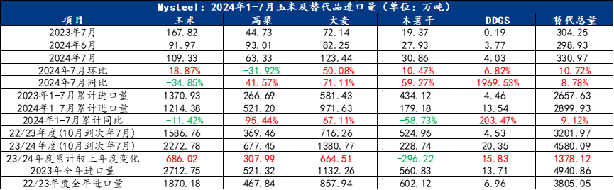 据中国海关数据显示:2024年7月国内玉米进口量105万吨,环比下降10.90%,同比下降36.79%。2024年1-7月份累计进口1214万吨,同比降11.42%。2023/2024年度累计进口量2273万吨,叫上年度同期增686万吨。据海关数据统计,按照自然年度计算,2024年1-7月玉米及相关替代品(玉米、高粱、大麦、木薯干、DDGS)累计进口量2900万吨,同比增加9.12%。按照玉米的作物年度(当年10月份到次年9月份)计算,截至2024年7月,2023/2024年度玉米及相关替代品(玉米、高粱、大麦、木薯干、DDGS)累计进口量4580万吨,较2022/2023年度增加775万吨。