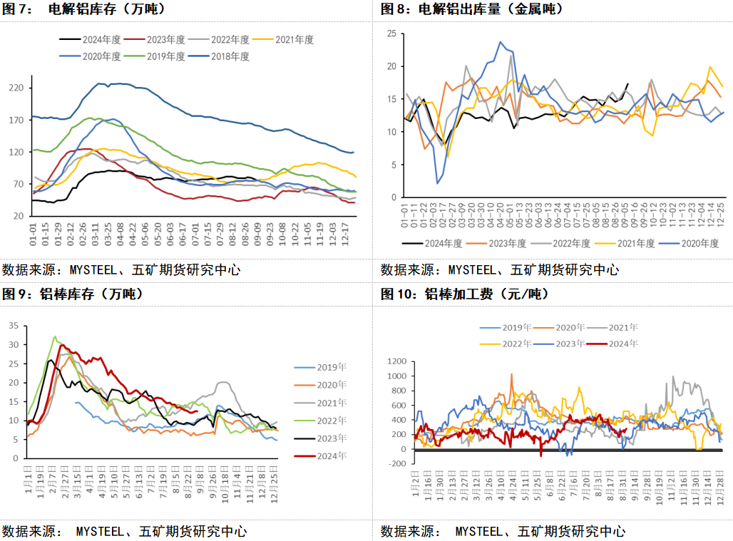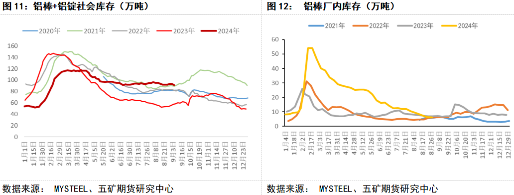 库存方面,国内铝锭铝棒库存呈现分化走势。铝锭方面,随着进口铝锭数量的减少,铝锭出库量增加迅速,整体库存在进入旺季后持续去化。与铝锭相比,铝棒库存去化速度显著走弱,8月铝水转化比例提高,铝棒产量增加,进而带动铝棒社会库存进入九月后呈现了累库的态势。整体而言,铝棒+铝锭的总社会库存在进入九月后呈现了去化的态势。