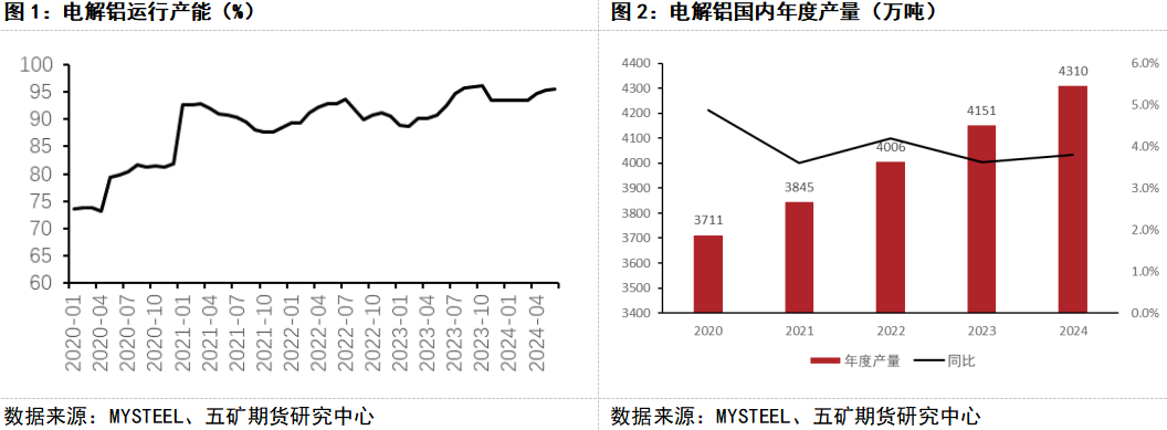 随着云南复产工作的完成以及内蒙地区新产能的投放,国内电解铝运行产能已经超过95%,基本达到理论产能天花板,供应端整体趋稳。按照现阶段运行产能推算,2024年全年国内电解铝理论产量4310万吨左右,整体增长3.6% 。