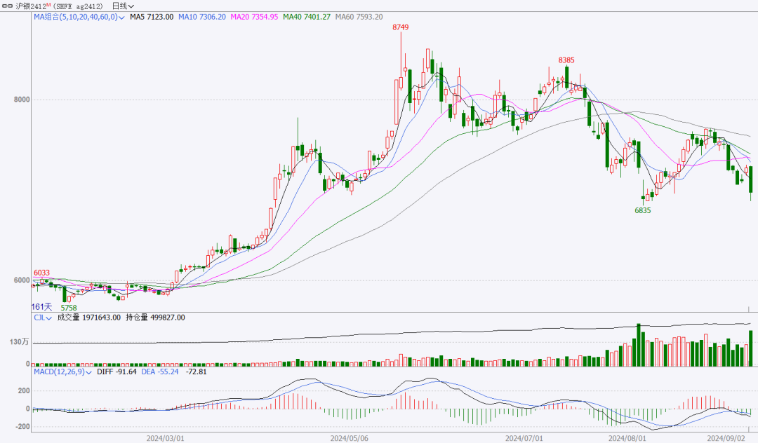 (1)上周五晚上美国非农数据公布14.2万人,不及预期的16万人,失业率小幅下滑0.1%,前值也被大幅下修,再添劳动力市场放缓迹象,虽然降息50个基点的预期有所上升,但是也难掩市场的悲观情绪,资金纷纷购买美国国债,风险资产遭到抛售,大宗商品普跌,也导致白银大跌将近300点,跌破7000整数关口。