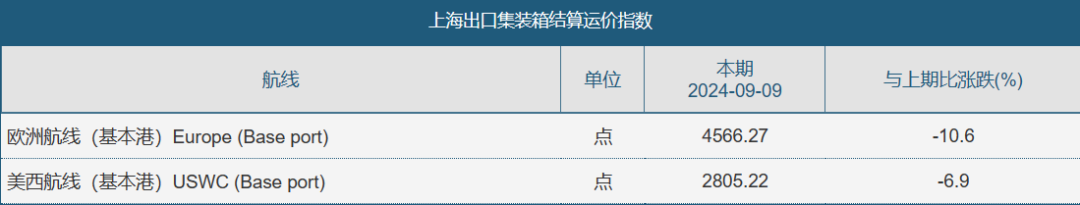 (2)指数方面,9月9日,上海出口集装箱结算运价指数大幅回落,欧洲航线结算运价指数下行至4566.27点,环比下降10.6%;美西航线结算运价指数下跌至2805.22点,跌幅为6.9%。